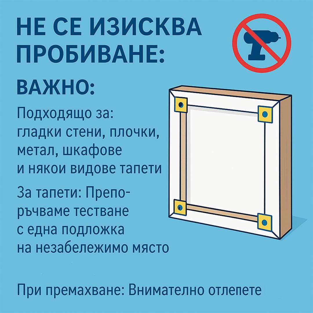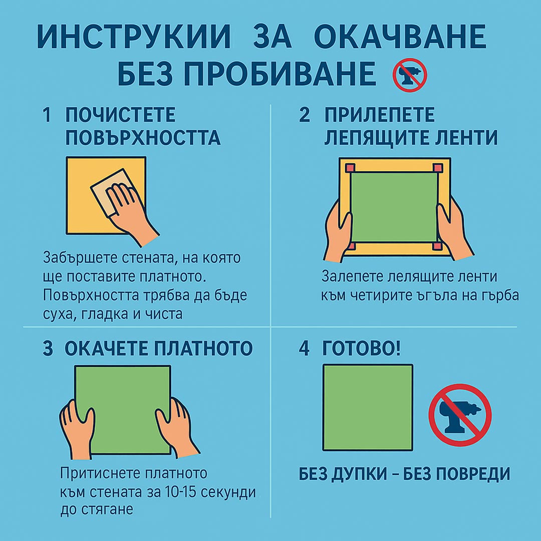 Към всяко платно изпращаме безплатно лепящи гумички, с които можете лесно да го окачите без пробиване и без инструменти. Подходящи за гладки стени, плочки, метал и някои тапети.Без дупки. Без следи. Без усилия.