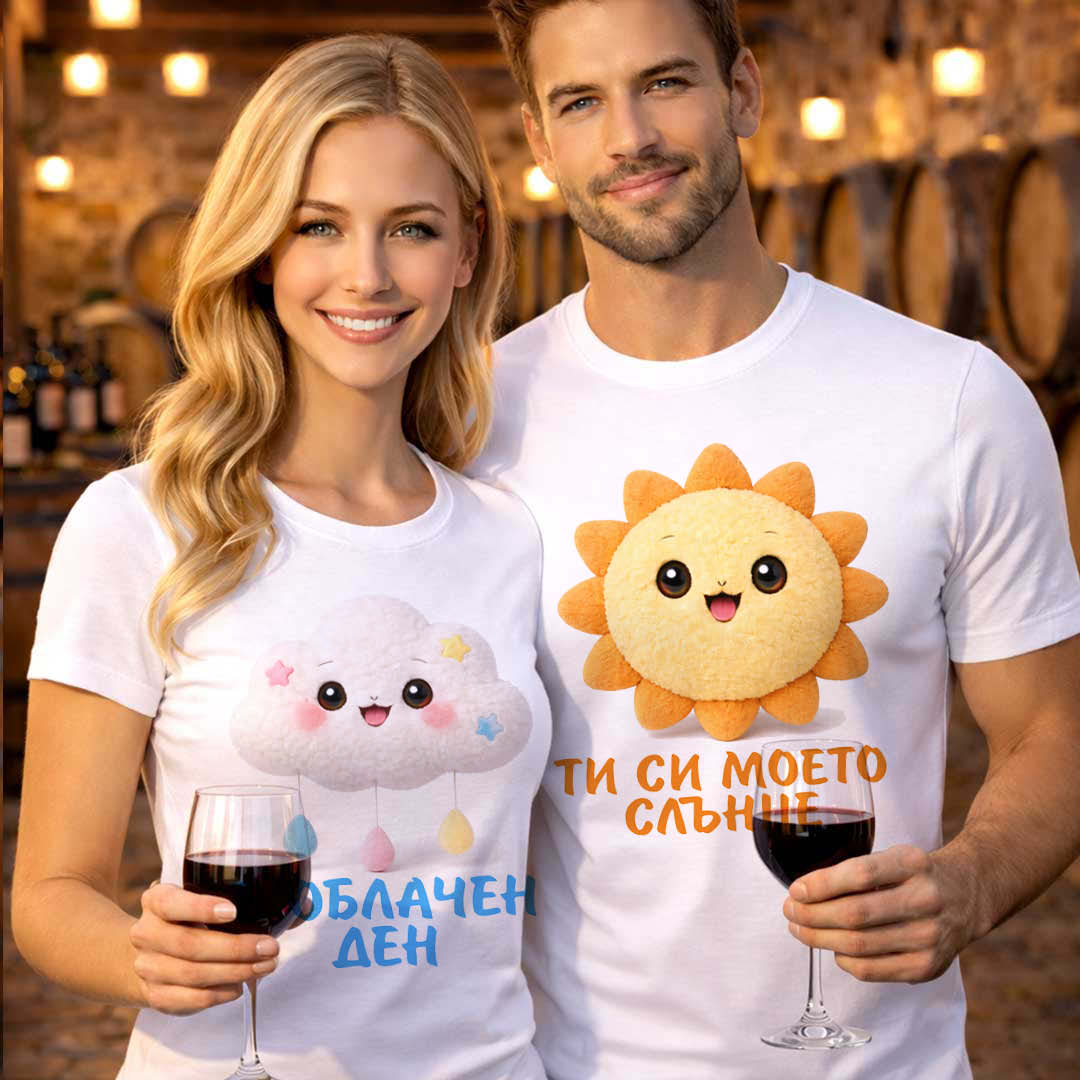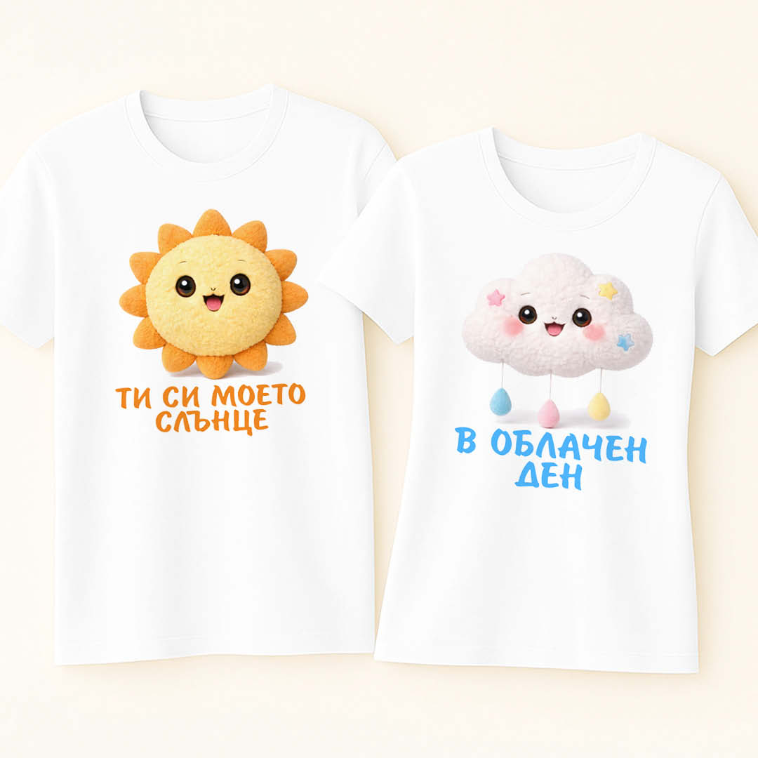 Нежен и закачлив комплект тениски за двойки с послание за любов и подкрепа – „Ти си моето слънце“ и „В облачен ден“. Перфектен избор за Свети Валентин, годишнина или подарък, който носи усмивки и топлина всеки ден. Дизайн, който казва „винаги сме заедно“. 💛☁️🎁