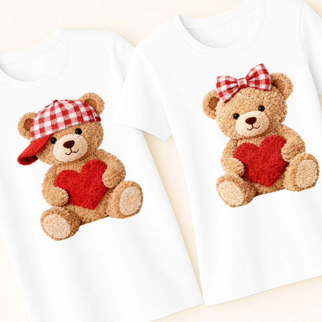 Нежен и закачлив комплект тениски за влюбени с очарователни плюшени мечета и сърца. Идеален избор за Свети Валентин, годишнина или сладък подарък за любимия човек. Дизайн, който носи уют, топлина и много любов. 💕🎁🧸