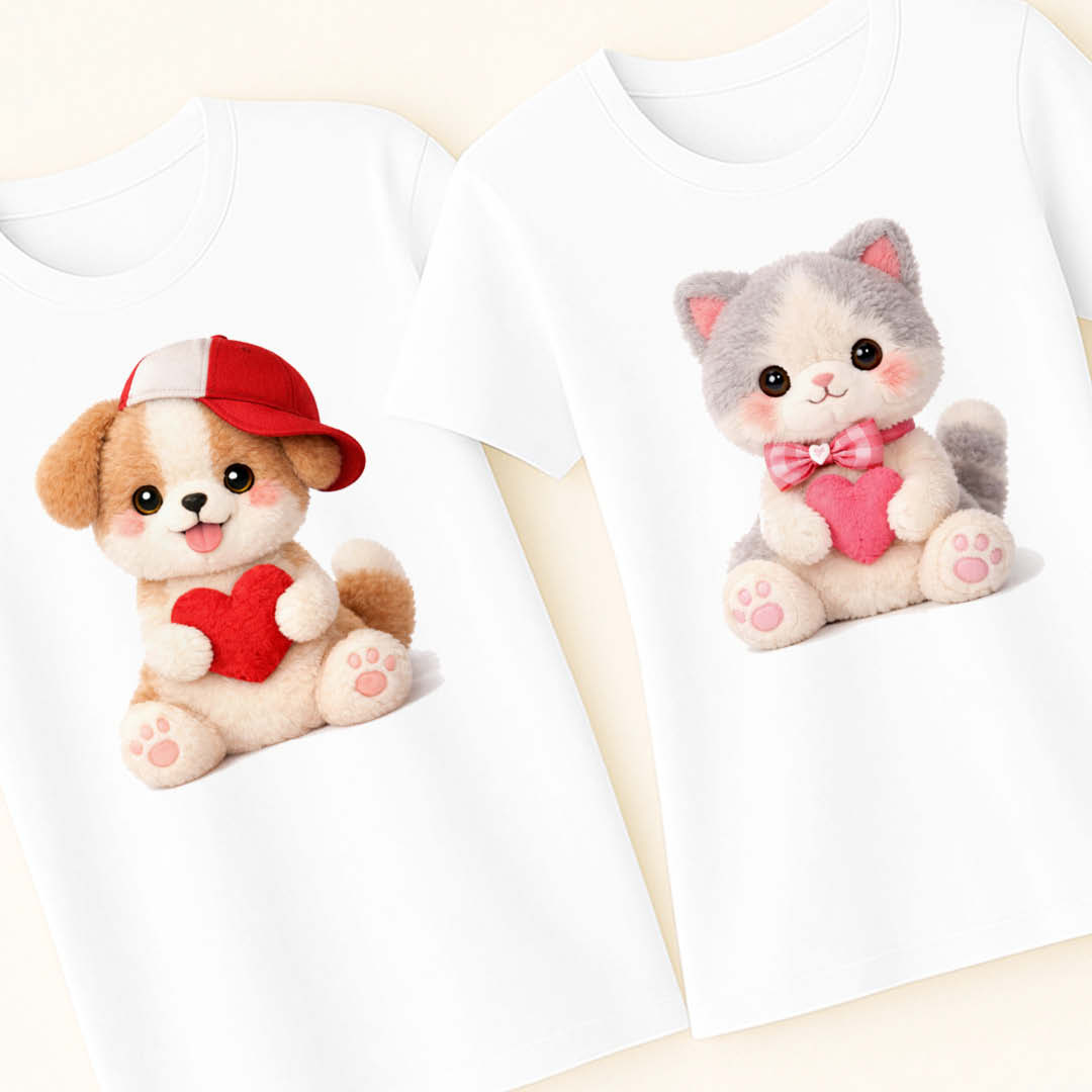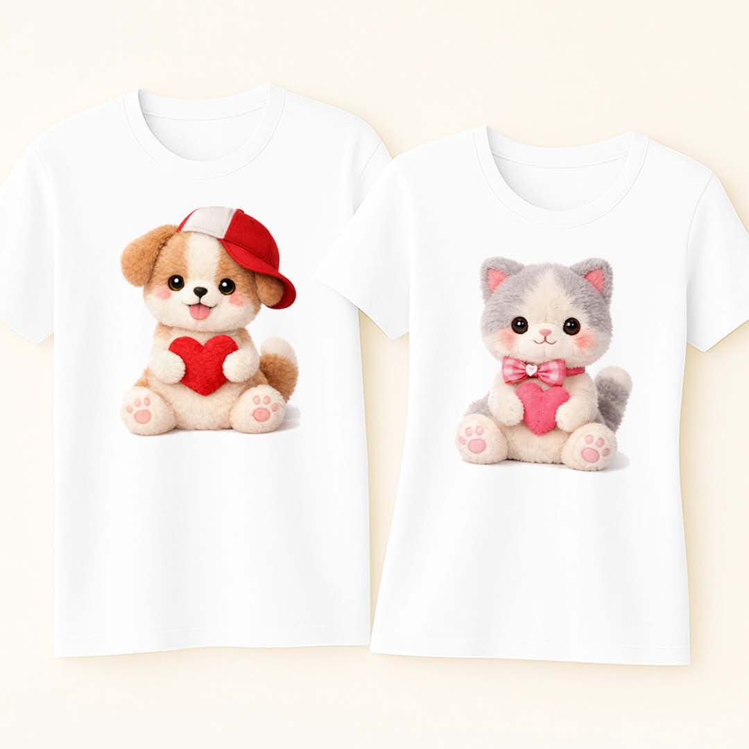 Очарователен комплект тениски за влюбени със сладки плюшени герои и сърца. Перфектен избор за Свети Валентин, годишнина или подарък, който казва „обичам те“ по нежен и закачлив начин. Дизайн, който носи топлина, усмивки и романтично настроение. 🧸❤️🎁