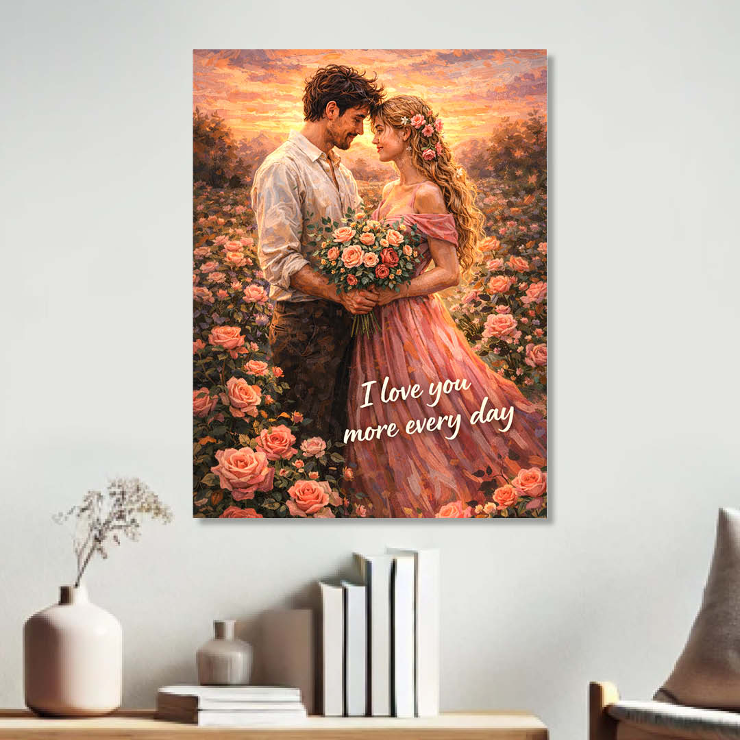 Романтична и нежна картина, изобразяваща влюбена двойка, прегърната сред разцъфнали рози в топлината на златен залез. Сцената носи усещане за близост, спокойствие и любов, която расте с всеки изминал ден.