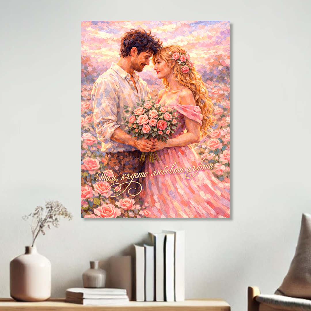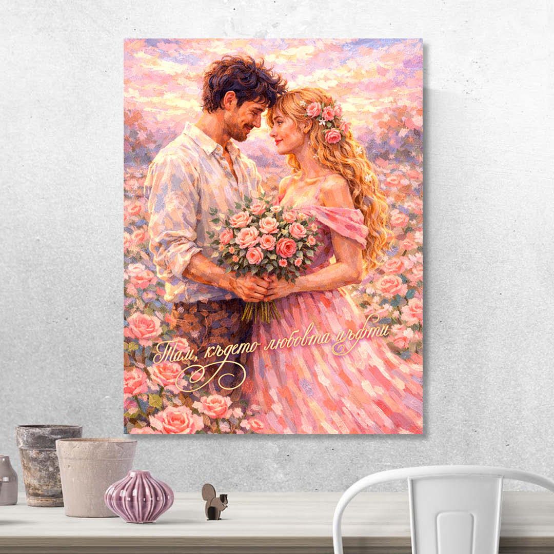 Нежна и романтична картина, изобразяваща влюбена двойка сред цъфнали рози, с изписано послание