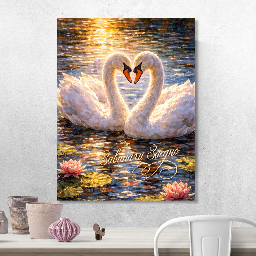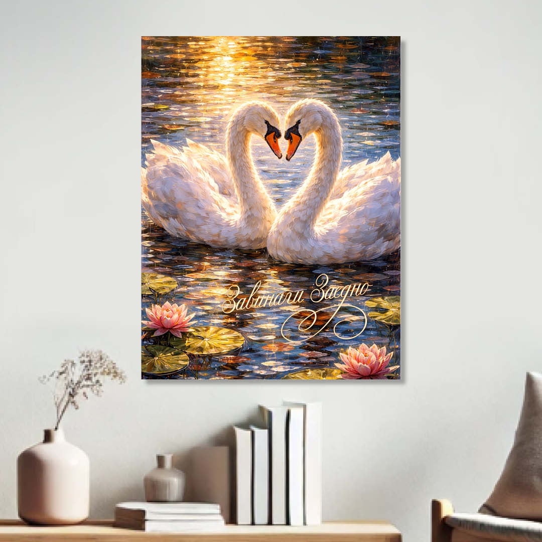 Нежна и символична картина, изобразяваща два лебеда, чиито шии се преплитат в сърце – вечен символ на вярност, любов и споделен път. Златистата светлина върху водата и фините отражения създават усещане за спокойствие, хармония и дълбока емоционална връзка.