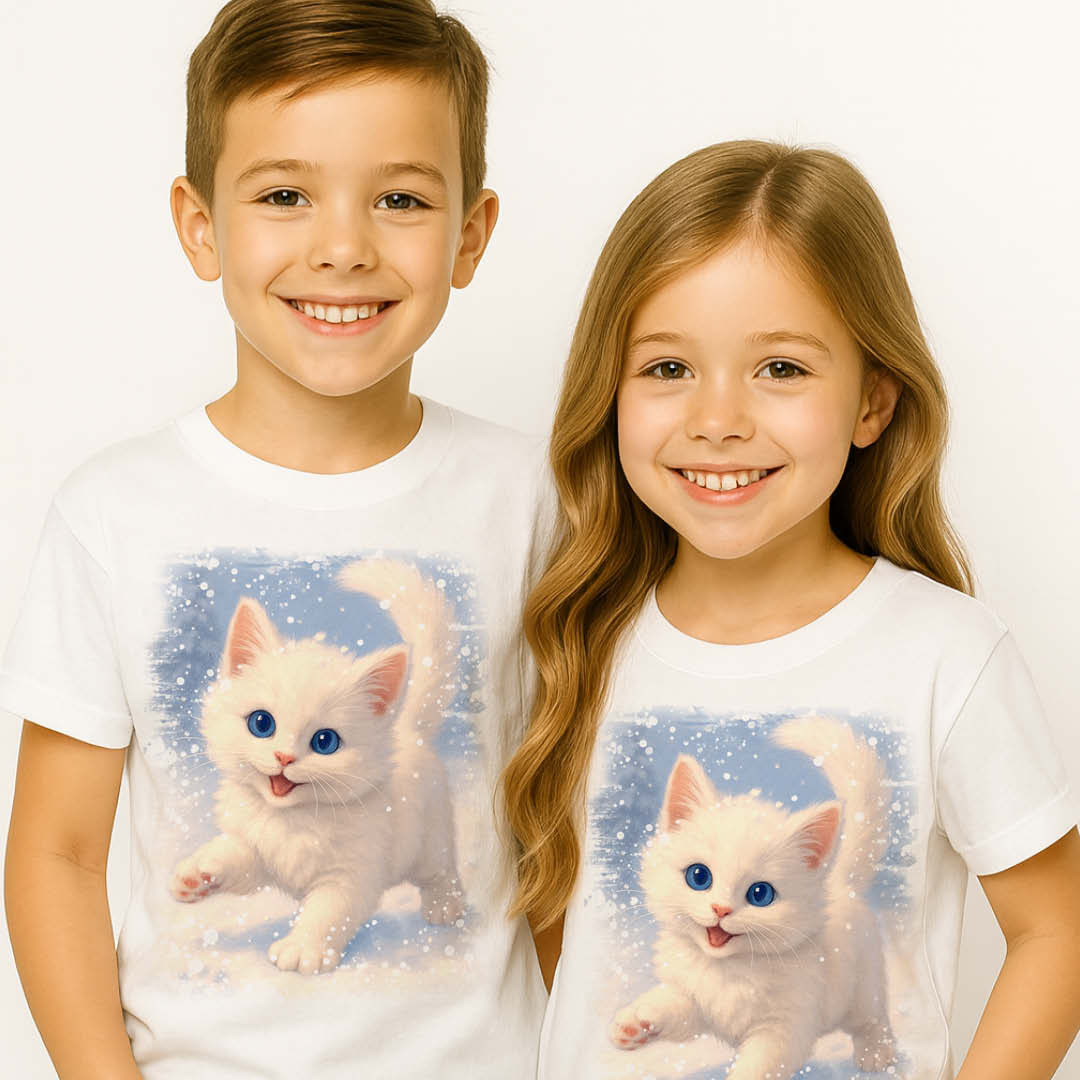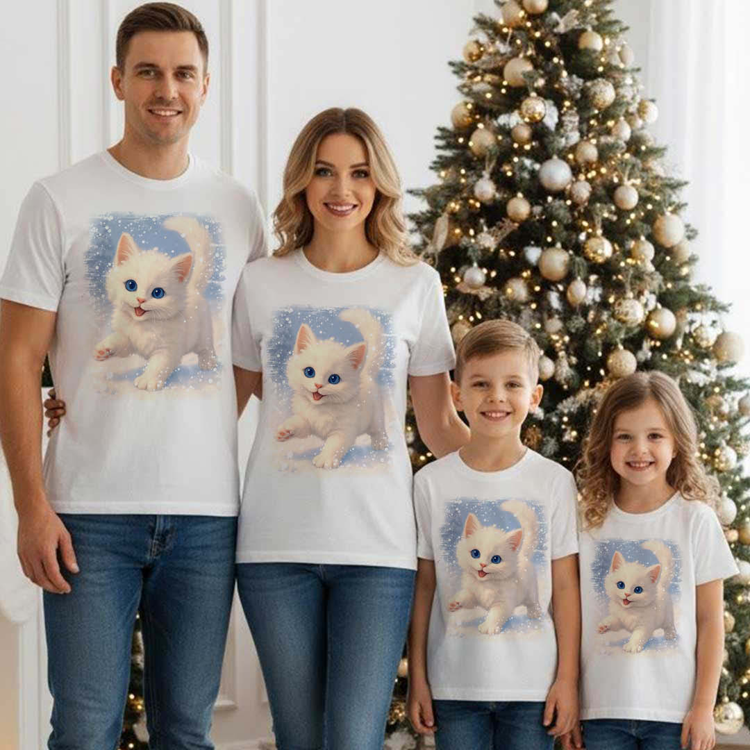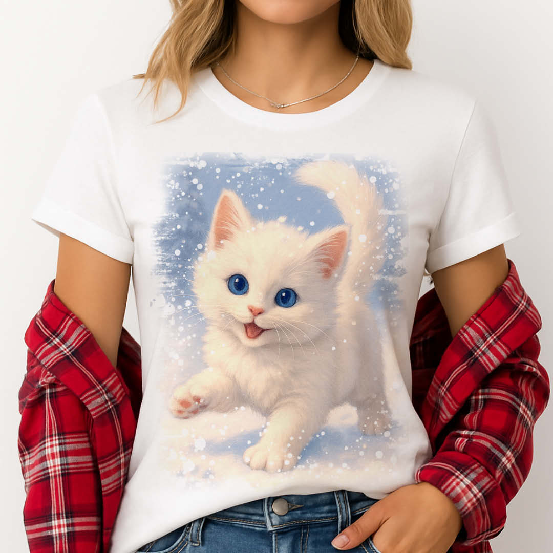 Вдъхновена от нежността на зимата, тази тениска с бяло котенце е символ на чистота, радост и уют. 🐾❄️